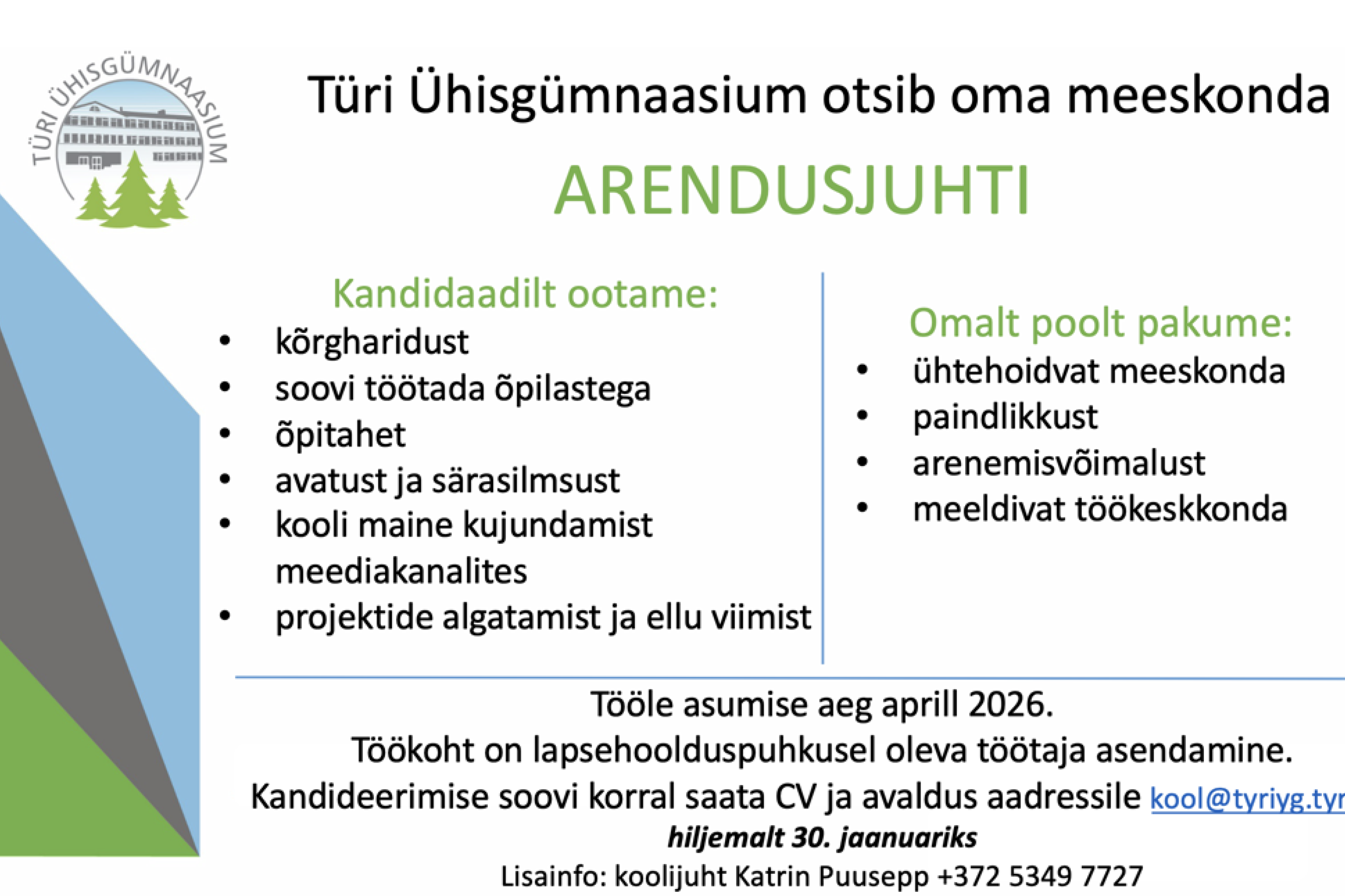 Kandideerimise soovi korral saata CV ja avaldus aadressile kool@tyriyg.tyri.eelink opens on new page hiljemalt 30. jaanuariks