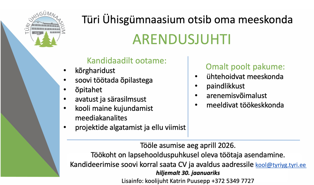 Kandideerimise soovi korral saata CV ja avaldus aadressile kool@tyriyg.tyri.eelink opens on new page hiljemalt 30. jaanuariks